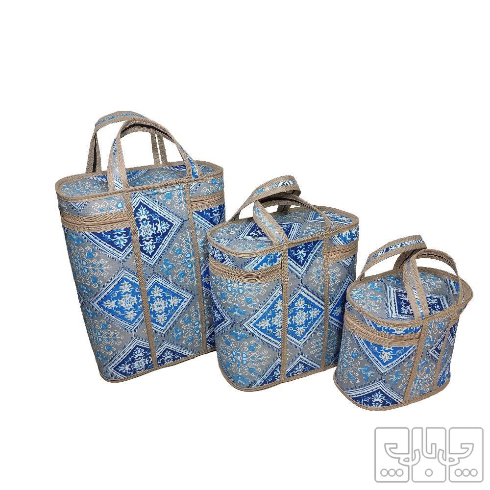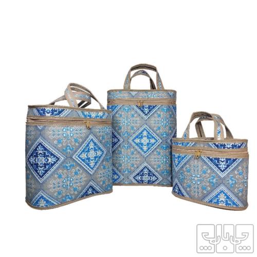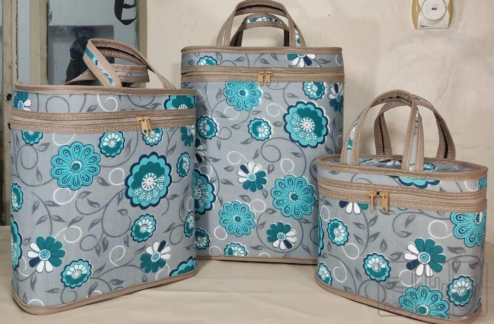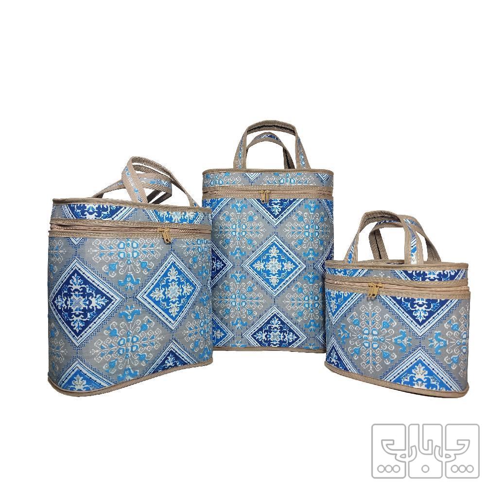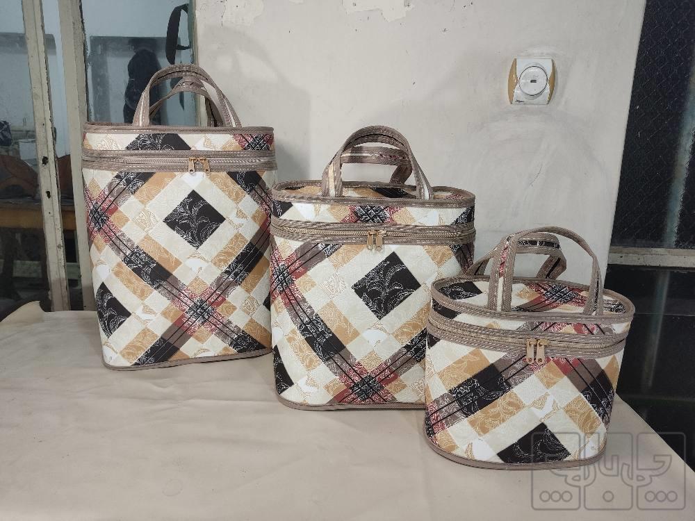کیف سه تکه پارچه 90 گرم پارچه ۳لایه(شامل پارچه ضخیم.فوم 2.5میلیمتری.آستر) پارچه دسته همرنگ با طرح اصلی در رنگ و طرح های شیک و دلنشین مناسب برای جهیزیه عروس.سییموتی نوزاد.کادویی و مصارف روزانه زیپ دو ماشینه و محکم