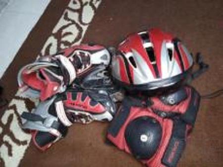 اسکیت کفشی ریلی کارکرده سالم مشکی قرمز دارای مچ بند زانو بند آرنج بند ترمز قابلیت تغییر سایز از 36 تا 39