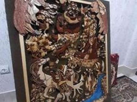 تمام ترکیب چوب رنگی طبیعی منبت کاری شده 5 بعدی ابعاد 1 متر در 1 متر و 30 بیش از 5000 قطعه پلی استر دو مواد الگو از اثر استاد فرشچیان مدت اتمام کار 8 ماه