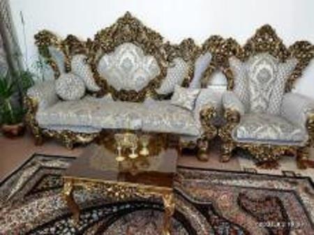 با سلام . مبلمان 9 نفره مناسب جهیزیه شامل ( یک عدد سه نفره جادار و بزرگ برای نشستن حتی چهار نفر ، چهار عدد تک نفره بزرگ و جادار ، دو عدد میزبان ) یک عدد جلو مبلی بزرگ و دو عدد کوچک پایه بلند همراه شیشه عسلی رنگ پارچه یزد درجه یک برجسته برابری با پارچه ترک جنس چوپ راش روکش طلا ، محکم دو عدد پرده کناره ست مبلمان