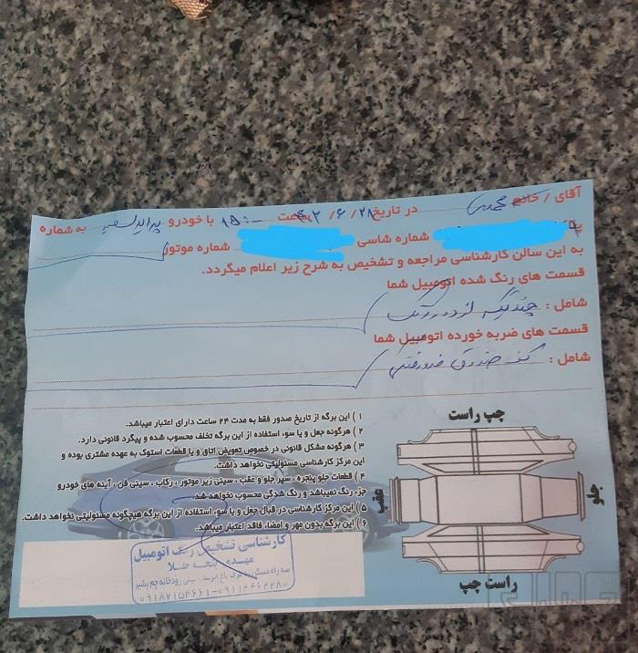 ماشین درب سمت شاگرد نصفش رنگه که شما بگو کلش رنگ دو تا گلگیر عقب هم رنگ دارد البته نه کامل شاسی کاملا سالم و پلمپ دوگانه کارخانه که واقعا روی گاز از بنزین بهتر راه میره از لحاظ موتوری هم هر دو ماه یه نیم لیتر روغن کم میکنه که همه ماشین های گاز سوز همینن مخصوصا فصل تابستان تاریخ کپسول ها هم یکی ۲۰۳۱ یکی هم ۲۰۳۲ همین امروزم تست هیدرو استاتیک گرفتم به مدت ۶ سال یعنی تا شیش سال نیاز به تست نداره معاینه هم یک سال کامل بیمه نه ماه کولر یخ توضیحات رو کامل نوشتم عکس کارشناسی و استاتیک هم گذاشتم