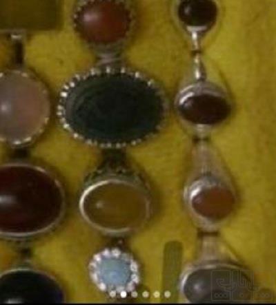 تعداد35عددانگشترنقره که حدود20تاش درحدنواست ومابقی استفاده شده بعضی هاش کج شده یارکاب شکسته یاترک دارن ولی سنگها سالم است رکاب فرهاد ورکاب مظفری وستوده اصفهان هم داره توش اکثرن دست سازه سنگ هم شجردریایی فیروزه وعقیق ویاقوت ویمن باباقوری کهربا
