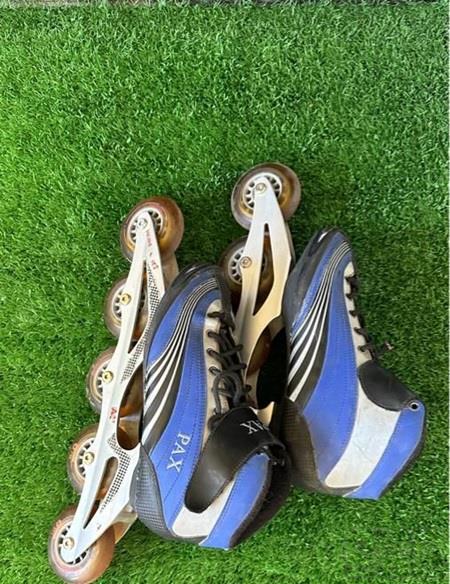 اسکیت ۵ چرخ حرفهای و در حد نو سایز ۳۸ اصلا استفاده نشده مدلش قدیمیه واسه همین یکم از رنگ و رو رفته از این ۴ چرخهای چینی امروزی نیست که زود خراب شه