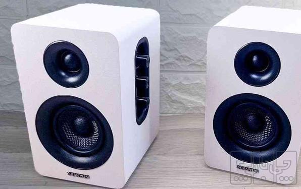 نو نو آک سالم صفر استفاده نشده با کارتون و لوازم دارای بلوتوث 5.2، درگاه AUX و درگاه USB C ولوم تنظیم گر باس، تریبلر و صدا بدنه سفید چوبی کربنی بلندگو ها از ابریشم بافته صدا فوق العاده