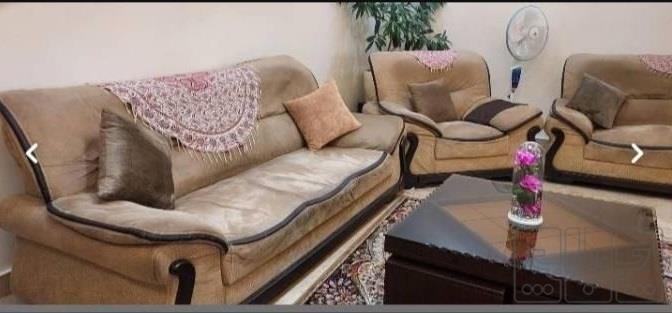 مبل راحتی ۷ نفره پارچه ترک رنگ نسکافه ای. سالم و بدون شکستگی و پارگی بدنه تمام چوب. همراه جلو مبلی و چهار عدد عسلی. میز وسط شیشه ۱۰ میل و عسلی ها دارای کشو است.