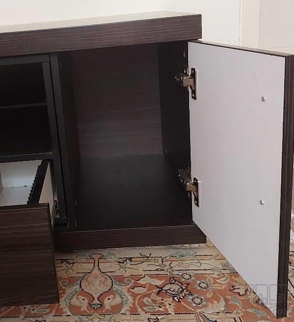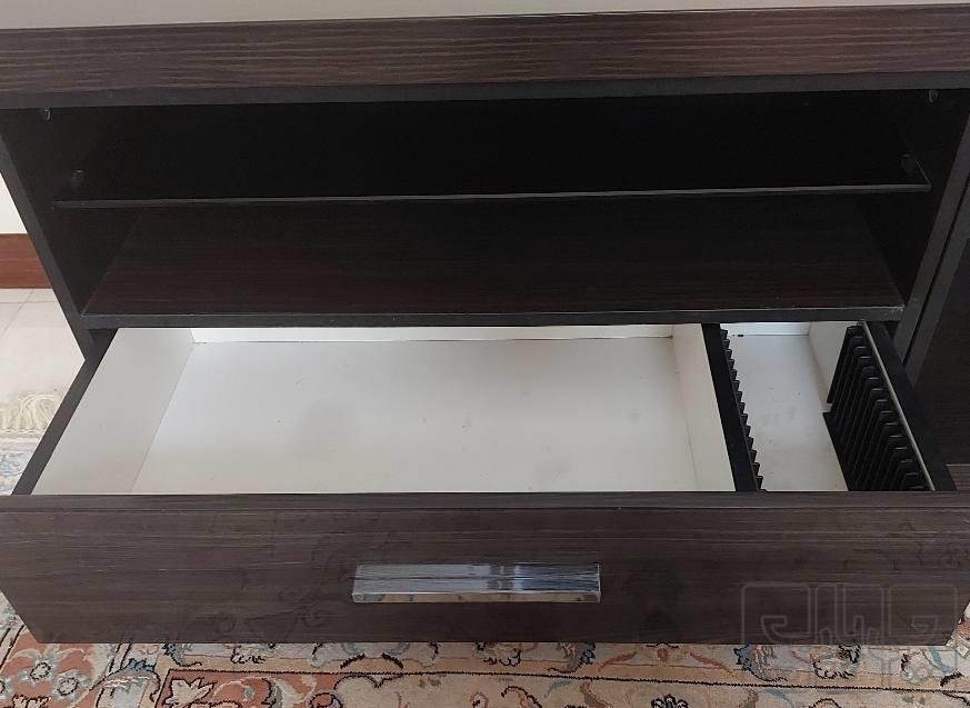 میز تلویزیون با قابلیت تغییر طول از ۱۱۰ تا ۱۴۰ بصورت کشویی داری طبقه بندی و کشو جنس ام دی اف های گلاس و ضدخش پایه های فلزی و کاملا سالم و محکم