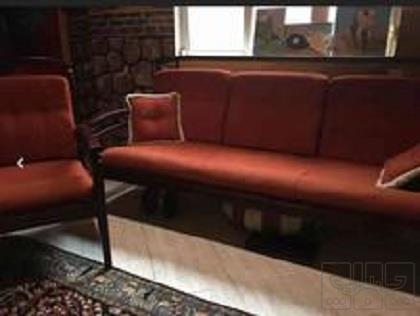 مبل 7 نفره دسته چوبی ، چوب و کلاف سالم پارگی نداره پشتی ها زیپ دار 4 عدد یکنفره و یک عدد سه نفره رنگ آجری