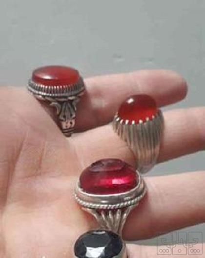 چهار تا انگشتر نقره عیار بالا دوتا عقیق سرخ آبدار و رکاب ها دستساز و محکم یاقوت سرخ درشت رکاب دست یاقوت کبود دو طرف رکاب علی ولی الله وزن کل حدود 60 گرم