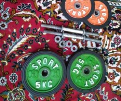 باسلام دوعددوزنه 5کیلویی و4 عددوزن2.5کیلویی دوتا دسته دمبل ویک هالتر وزنه 5 کیلویی ها به هالترم میخورند