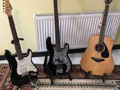 3 دستگاه ساز بیس اریا(پیکاپ اکتیو،سیم نو. رگلاژ شده. کاور و بند پایه) اکوستیک 12 سیم یاماها کاملا نو بهمراه کاور بند پایه این ساز کاملا خوش صدا و عالیه الکتریک اریا بهمراه کاور پایه بند و سیم نو