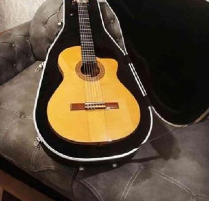 گیتار حرفه ای فلامنکو ساخت اسپانیا سری اول با امضای اورجینال سازنده گیتار بدون هیچگونه خط یا زدگی میباشد در حد نو پیکاپدار بسیار حرفه ای دارای هارد کیس فابریک بسیار شیک و محکم