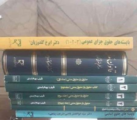 تعدادی کتب وکالت وحقوقی تست آیین دادرسی مدنی عمروانی ،حقوق تجارت محمدمهدی توکلی تست عظیم زاده براآیین دادرسی کیفری ، کتابچه ی قانون اساسی جهانگیرمنصور ،قوانین خاص کیفری وحقوقی