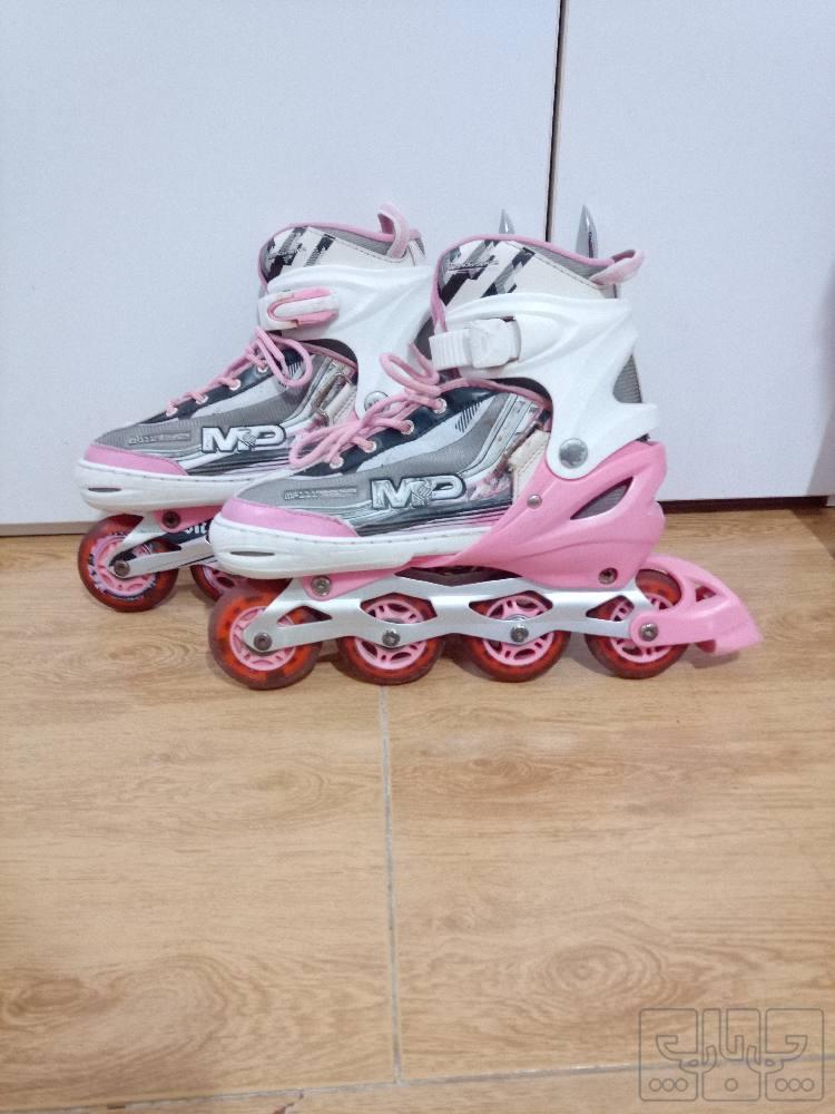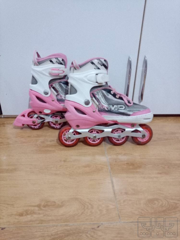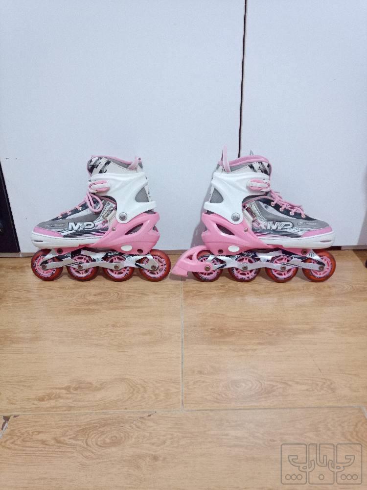 درود بر همگی شما عزیزان یک جفت اسکیت کفشی برندMpمدل 111 جنس چرخهاش ژله ای ضد سایش کلا5.6بار استفاده شده سایز قابل تنظیم از35تا43 جنس پایه نگهدارنده چرخ ب کفش آلمینیوم