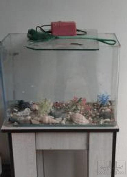 آکواریوم شیشه خم با پایه وسایل سالم تمیز طول 50 عرض 30 ارتفاع 40 یک پمپ هوا شن پنج صدف بزرگ زیبا تور ماهی گیری علف گل مصنوعی پایه دماسنج