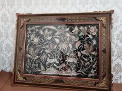 تابلو خاتم و قلمزنی طرح گل و مرغ اندازه قاب 70*90 اندازه پلاک قلم زنی 50*70 تولید اصفهان کل قاب لعاب کاری شده چوب گردو تزئین شده با نقره و برنج و مس که دور قاب کار شده پلاک گل و مرغ هم جنسش مسی هست انتیک و لاکچری و بسیار زیبا