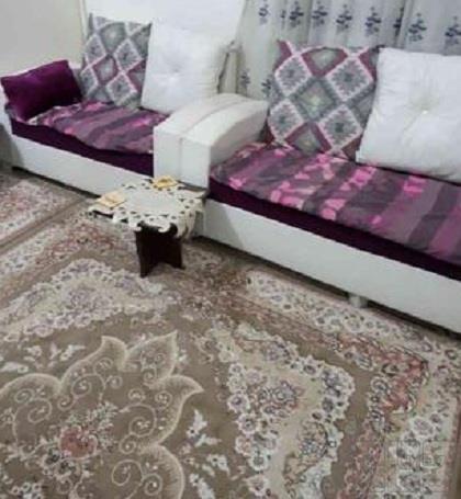 مبل راحتی شیک. و تمیز با 7 عدد کوسن سفید بنفش ست مبلا مناسب خونه های جمع و جور با فضای کم مناسب دفتر کار و آرایشگران