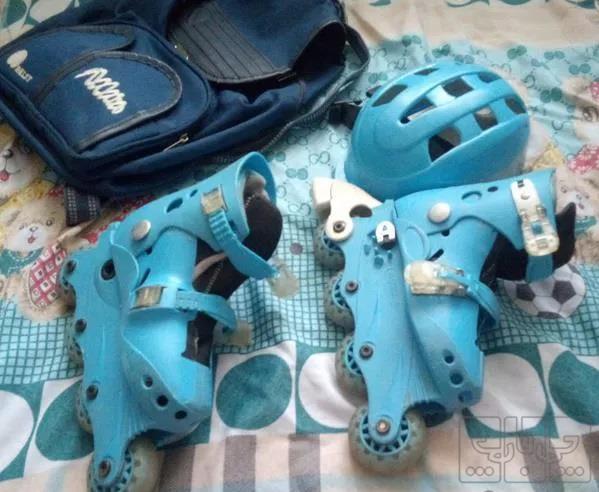 اسکیت بچگانه به رنگ آبی به همراه کلاه و کیف و زانو بند