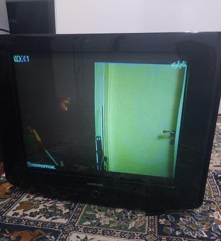 تلویزیون تمیز و سالمه صفحه تخت کم کارکرد فقط کمی کم رنگه تو عکسم مشخصه کنترل داره