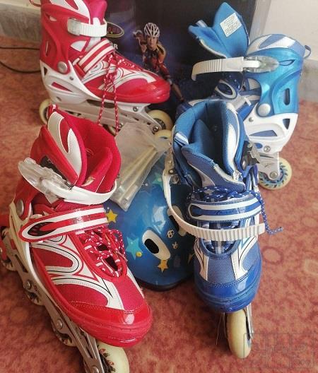 دو جفت کفش اسکیت مارک فردوس قرمز ها از سایز34 تا 37 با قابلیت تغییر سایز و آبی ها از سایز 30 تا 33 با قابلیت تغییر سایز به علاوه دو عدد کلاه ایمنی اسکیت در اختیارتون قرار میگیره اسکیت ها فقط دوبار استفاده شده اند و هیچگونه خرابی ندارند