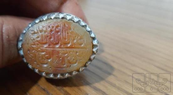 انگشتر خطی کلکسیونی خط چپ نویس دو سر خط روی انگشتر خط چپ نویس و زیر انگشتر پنج تن العبا رکاب سیاه قلم مزین به ذکر (یا ابا عبدلله) و (یا حسین شهید) رکاب دور چنگ که روش 27 عدد سنگ معدنی الماس تراش کار شده نگین سنگ در اصل نگین گردنبند بوده و سنگ انگشتر عقیق یمنی است کهنه کهنه بکر بکر وزن 38 گرم