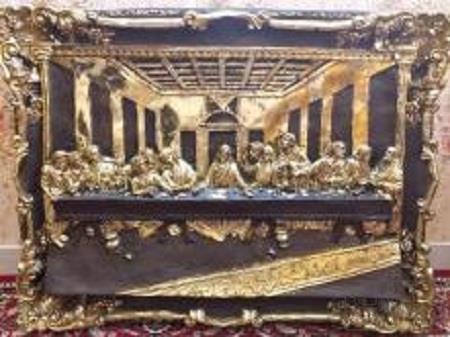 پلی استر رزینی ورق طلا ابعاد 125 در 95 یه بند انگشت در پشته گوشه تابلو پریده ک اصلا معلوم نیس یک چهارم این تابلو رو بیرون میدن 650 موجوده، به ابعاد دقت کنید خیلی بزرگه