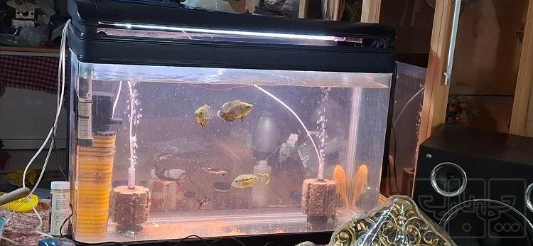 یک عدد آکواریوم شیشه خم شرکتی شیشه در اندازه ی ۱۰۰*۴۰*۷۰ با سامپه فابریک پمپ اب آب ۲ عدد چراغ ال ای دی کشتی شکسته ۹ عدد ماهی