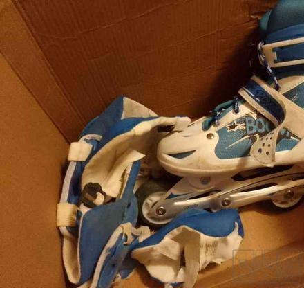 اسکیت کفش آبی هم دخترونه و هم پسرونه کلا چند بار استفاده شده چرخ کاملا ژله ای اصلا سور نمیخوره از سایز )37تاااا 42 ترمز 85 درصد داره بلبرنگ ها سالم و روغن کاری میشده که زنگ نزنه کلا شاید 5 بار بیرون بردم بقیش داخل خونه بود خدا شاهد 3 سال پیش 600 الان بالای 900 هست همراه با دست کش .. زانو بند ... قلم بند همه جوره نو به شرت داده میشه