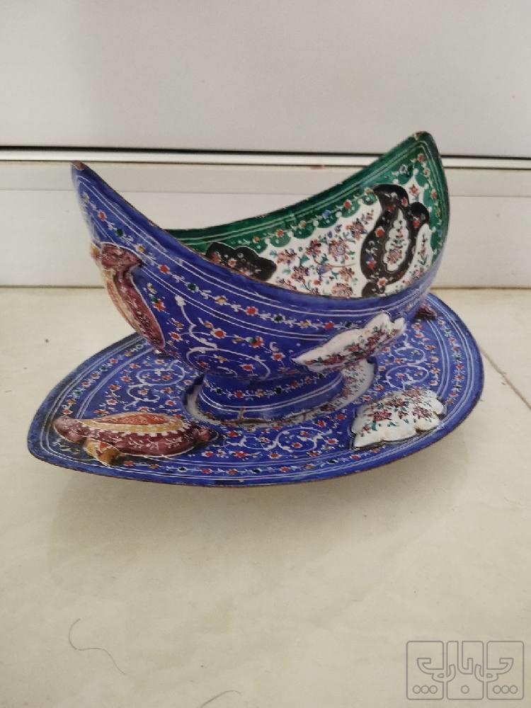 ظرف قایقی شکل ..یا کشکول با ظرف سینی مانند زیرش ..مینا کاری روی مس .قدمت حدود هشتاد سال ..فقط توی خانه ماهست..دکوری .مورد استفاده .برای آجیل شکولات یا شیرنی ریز ..یادکور.قیمت گوگل بزنین تا 180دلار خریدوفروش شده...