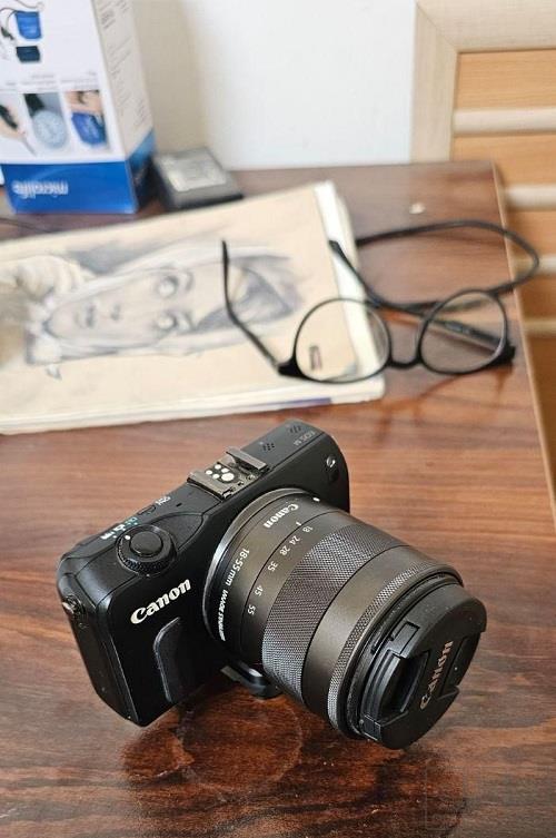 دوربین کم کار و سالم بدون خط خش بدنه فلزی دوتا لنز ۱۸ ۵۵ و ۲۲ میلی اف ۲ کنون eos m بدون آینه قابلیت فیلم برداری و عکاسی مناسب مصاف خانگی و مراسمات