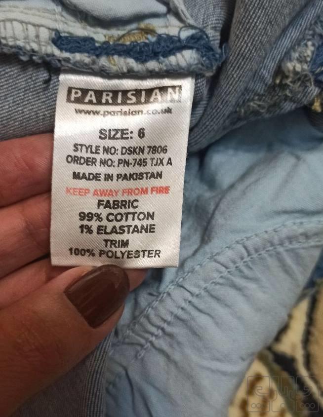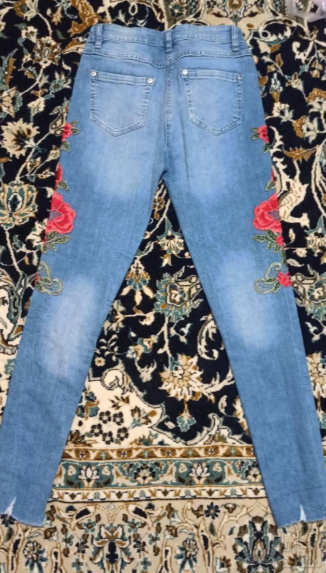 شلوار جین آبی ساخت پاکستان،بغلاش گلدوزی شده وخوشگل ترش کرده،به سایز ۳۶و۳۸ریز که پاهاش تپل نباش میخوره،در حد یه ساعت پوشیده شده ،تو عکس ها هم معلومه .چون جا زانو هم نداره.خیزتم کاملا نو،ولی تو کپشن گفتم که مدیون نشم .دوستان قسمت جنس نمیدونستم چی بزنم زدم نخ