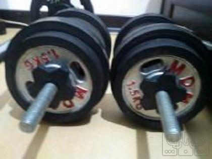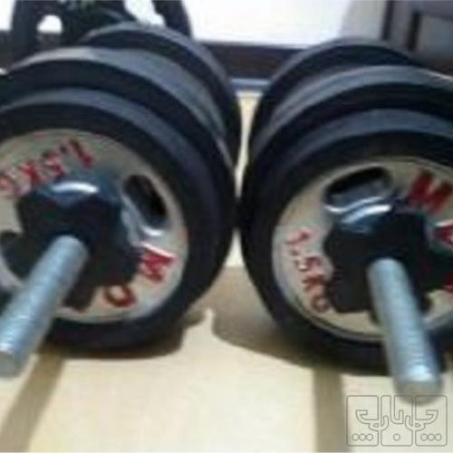 یک جفت دمبل دور لاستیکی . هر دمبل 8 کیلو میله هالتر 1/20 سانتی دو عدد وزنه 5 کیلویی کلا 28 کیلو وزنه